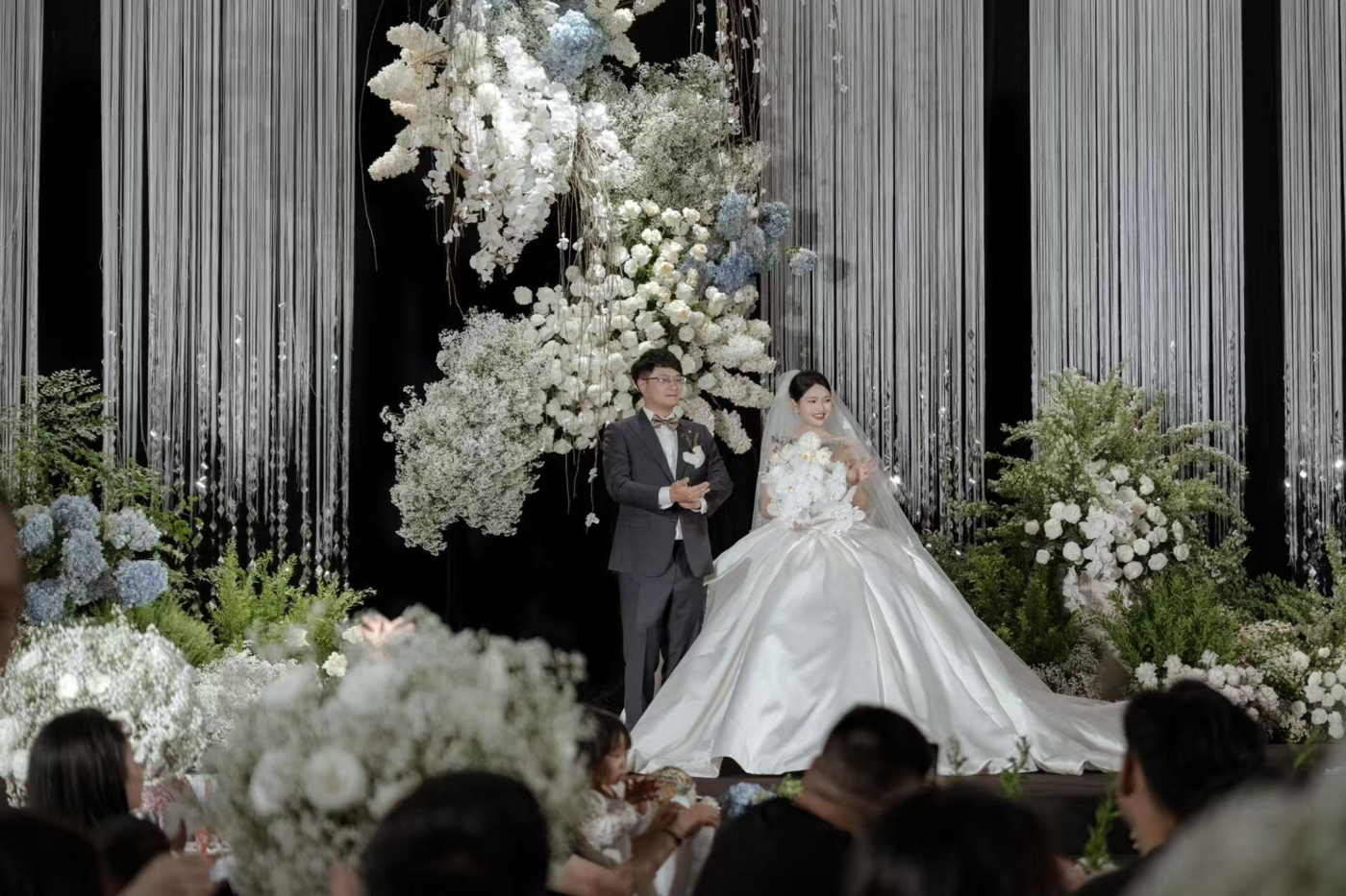 再一次颠覆韩式婚礼的概念 这是一场高级的韩式婚礼 我们用了160盏水晶灯作为吊顶元素 在整个婚礼圈看厌水晶的时候 我们用大结构包裹水晶 呈现不一样的韩式风格 。让水晶不那么主角 又偏偏提升了整场高级感。